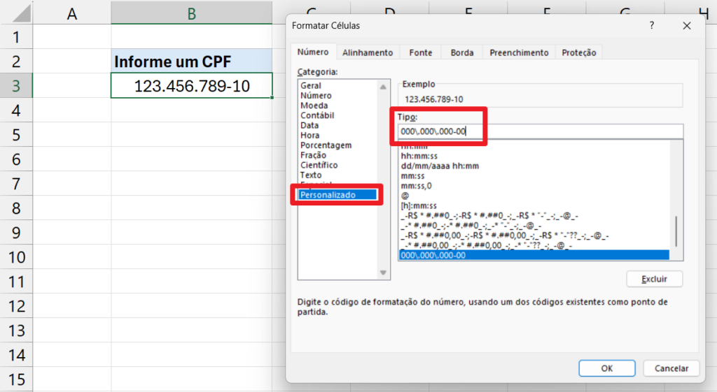 Primeiro vamos criar uma formatação personalizada de número para exibir o CPF com a formatação com números e pontos. Isso vai garantir que visualmente, na célula onde for digital o CPF consigamos identificar todos os 11 caracteres (inclusive dos CPFs iniciados em zero).