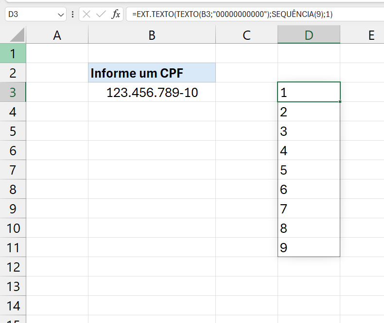 Na sequência vamos utilizar a função EXT.TEXTO para extrair cada um dos 9 primeiros caracteres individualmente. A função SEQUÊNCIA é responsável por criar a lista de 1 a 9 que vai indicar a posição do caractere a ser extraído.