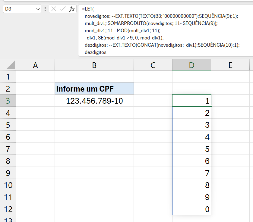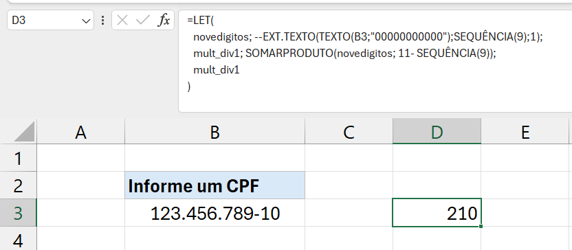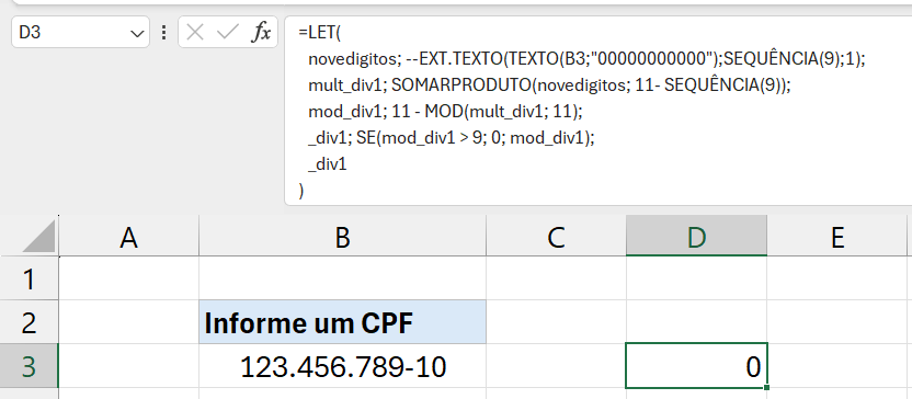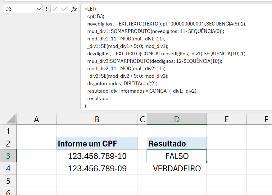 Uma dica extra é criar um nome no início da função LET para armazenar a célula com o CPF que está sendo verificado, que no exemplo é a célula B3.