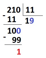 4) O resultado obtido (210) será divido por 11. Considere como quociente apenas o valor inteiro obtido na divisão, o resto da divisão será responsável pelo cálculo do primeiro dígito verificador.
