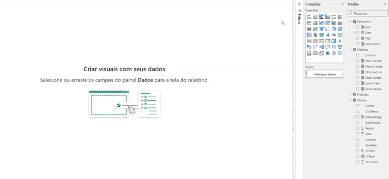Quando você abre um relatório totalmente em branco no Power BI, você verá a mensagem “Adicione dados ao seu relatório” no meio da tela. É fundamental importar nossos dados para criar uma análise eficaz.
