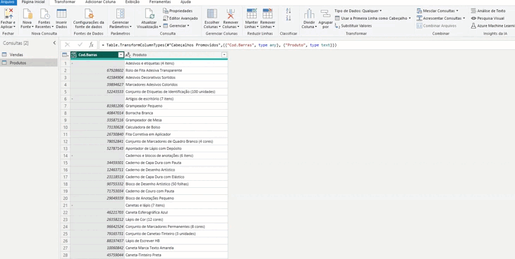 O Power Query vai adicionar uma nova etapa ao processo de transformação, mostrando o que foi modificado.
