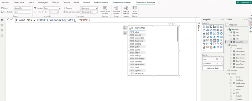 Para obter o nome do mês, uso a função “FORMAT” com a expressão “FORMAT(Calendario[Data], ‘MMMM’)”, onde ‘MMMM’ retorna o nome do mês por extenso.