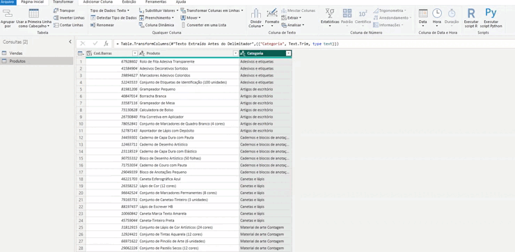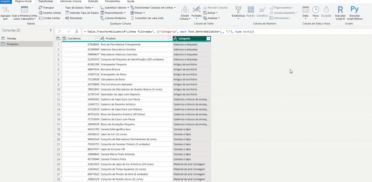 Em seguida, vamos remover a quantidade de itens por categoria que ainda está na coluna do produto. Para isso, clicamos em “Transformar” e selecionamos “Extrair texto antes de um delimitador”. Escolhemos um parêntese como delimitador para remover a parte que não nos interessa.