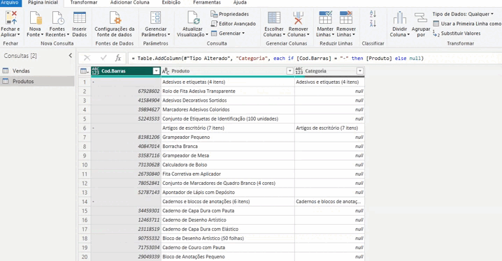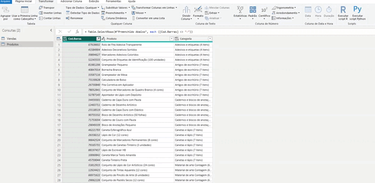 Agora precisamos filtrar as linhas para remover aquelas que contêm categorias em vez de produtos. Clicamos na coluna do código de barras e filtramos as linhas com hifens.