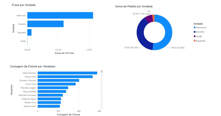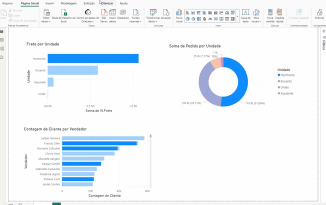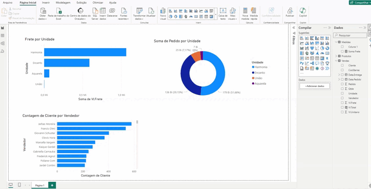 Quando arrastamos um campo, automaticamente o Power BI gera um relatório baseado no tipo de campo que foi arrastado. Então, se quisermos vê o valor do frete por unidade, por exemplo, podemos pegar o campo “Unidade” e arrastar para o visual. Automaticamente, dá a soma do frete, mas agora por unidade.