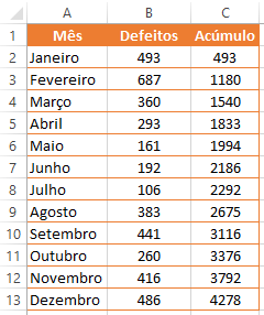 Numa planilha onde são listadas as quantidades de defeitos mensalmente, deseja-se calcular o valor acumulado de defeitos ao longo do ano.