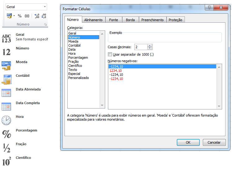 Na imagem a seguir você vê, a esquerda as opções de formatação de número através da faixa de opções, e a direita um exemplo de formatação através da caixa de diálogos.