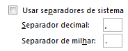 Obs: A vírgula e o ponto são os caracteres de separadores padrões, configurados para o idioma Português (Brasil). Alguns países utiliza a vírgula como separador de milhar e o ponto como separador decimal. Se desejar alterar os separadores padrões, siga o seguinte caminho: