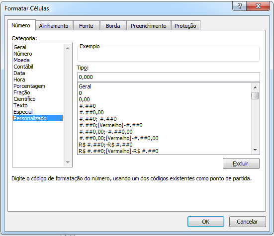 É importante entender que qualquer formatação selecionada em qualquer umas das categorias, pode ser escrita utilizando uma sequência lógica de caracteres. Ainda na caixa de diálogo de formatação de células (Ctrl + 1) selecione o formato número e defina 3 casas decimais. Após definir o formato, clique na categoria Personalizado e repare na caixa de texto Tipo: