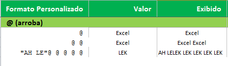- @ (arroba)→ Máscara para texto. Cada arroba representa o 1 vez o texto da célula.