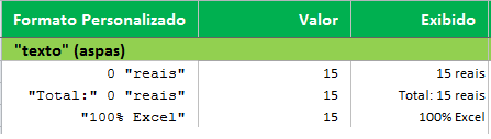 - A quarta seção somente é refletida se o valor da célula não for numérico e será aplicada ao texto contido na célula.