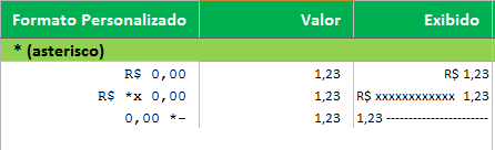 - * (asterisco) → Repete o próximo caractere até preencher o espaço vazio na célula.
