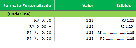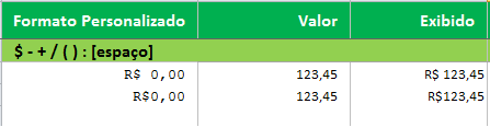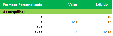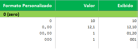 A sequência acima determina exatamente que o número deve ser exibido com 3 casas decimais. Para podermos criar nossas formatações personalizadas é necessário entender como essa sequência de caracteres funciona, e quais são os caracteres que podem ser utilizados.