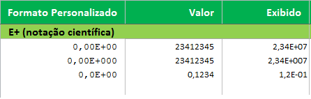 - Científico: Este formato é utilizado para mostrar números no formato de notação científica. O número 1000 (mil) que seria 1 x 10³ é exibido 1,00E+3. O caractere E (maiúsculo) representa que este número a sua esquerda está multiplicado por 10 elevado ao número a sua direita.