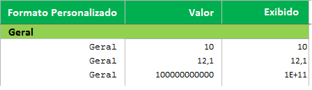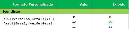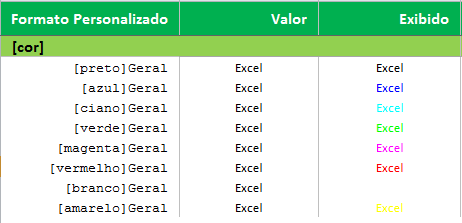 Ao utilizar uma cor entre colchetes antes do formato Geral, em cada uma das seções, este formato define o valor será exibido com uma cor diferente, dependendo do valor. Verde para os valores positivos (primeira seção), vermelho para os valores negativos (segunda seção), preto para o valor zero (terceira seção) e azul quando for um texto.