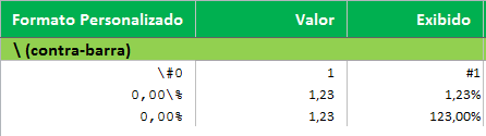 - \ (contra-barra) → Exibe o próximo caractere. Útil para quem deseja exibir um dos caracteres dos códigos, anulando seu efeito original no formato.
