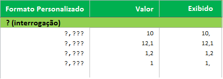 - ? (interrogação) → Máscara para números. Exibe um espaço na posição de zeros insignificantes. É ideal para usar quando se quer exibir uma quantidade fixas de casas decimais, mas não deseja exibir zeros insignificantes.