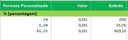 - Porcentagem: Exibe os valores no formato porcentagem. Você pode configurar a quantidade de casas decimais.